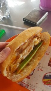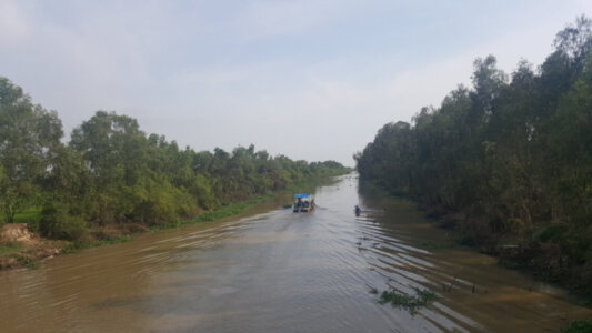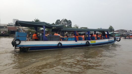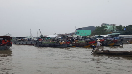 Um 7:15 Uhr wurde ich von einem schlecht gelaunten, unfreundlichen Guide in meinen „Hotel“ abgeholt. Sie würden bereits seit 15 Minuten in einem anderen Hotel auf mich warten. Die anderen 20 ! Tourteilnehmer, sahen mich entsprechend grimmig an 😉 Zu Fuss ging es zum Bootsanleger. Orange Rettungswesten anziehen und los ging es zum (angeblich) größten Floating Market Vietnams. Das gleiche hatten nochmal 20 weitere Boote vor und so reihten wir uns ein. Die großen Schiffe „verkaufen“ und hängen das was sie verkaufen an einen langen Stab, damit es für alle sichtbar ist.