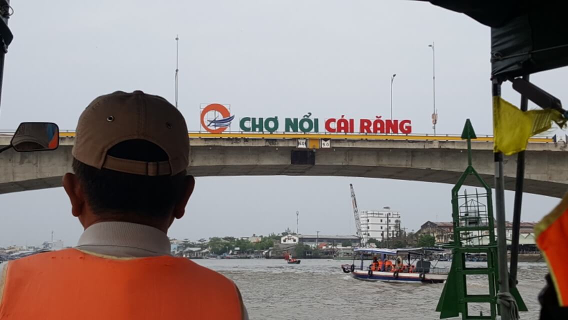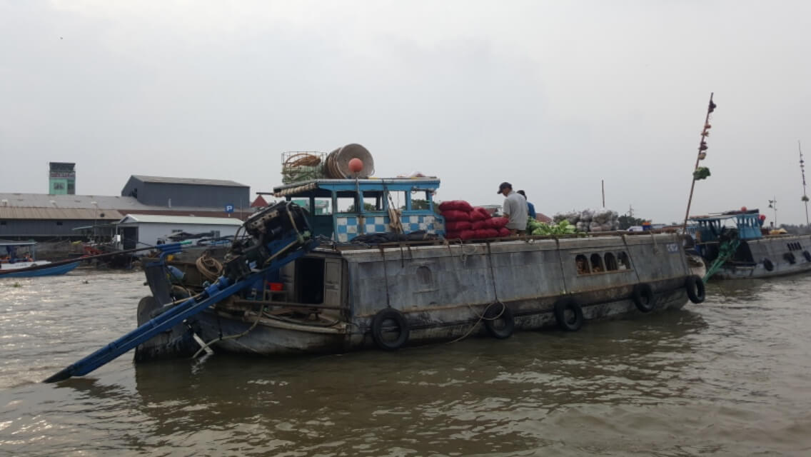 Um 7:15 Uhr wurde ich von einem schlecht gelaunten, unfreundlichen Guide in meinen „Hotel“ abgeholt. Sie würden bereits seit 15 Minuten in einem anderen Hotel auf mich warten. Die anderen 20 ! Tourteilnehmer, sahen mich entsprechend grimmig an 😉 Zu Fuss ging es zum Bootsanleger. Orange Rettungswesten anziehen und los ging es zum (angeblich) größten Floating Market Vietnams. Das gleiche hatten nochmal 20 weitere Boote vor und so reihten wir uns ein. Die großen Schiffe „verkaufen“ und hängen das was sie verkaufen an einen langen Stab, damit es für alle sichtbar ist.