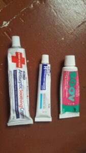 Die Stiche jucken entsetzlich! Nachdem all meine Salben nicht halfen, hab‘ ich mir eine Cortison-Salbe gekauft.
