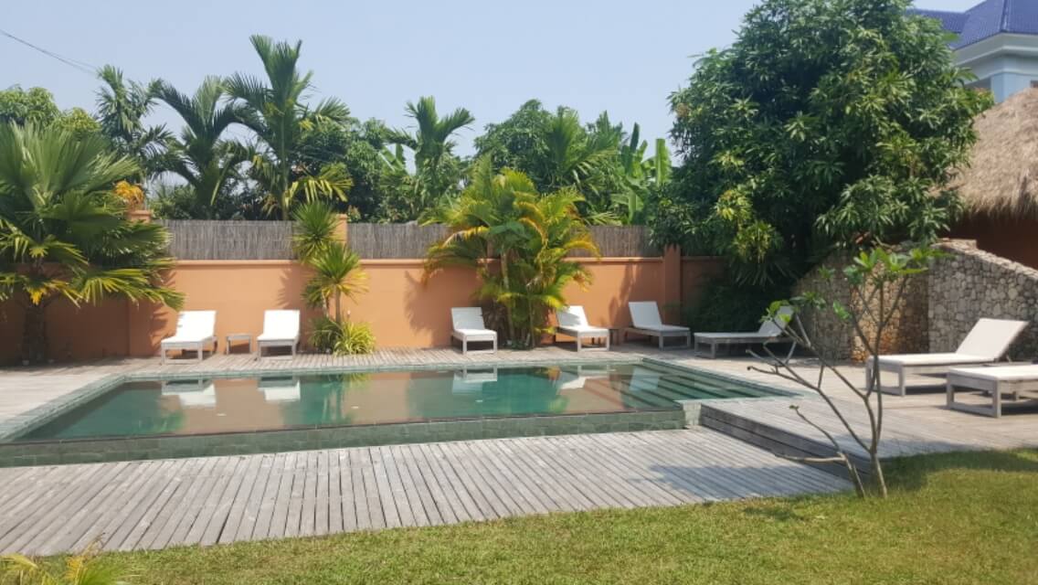Ich bin in einer netten Unterkunft mit einem kleinen Schwimmingpool.