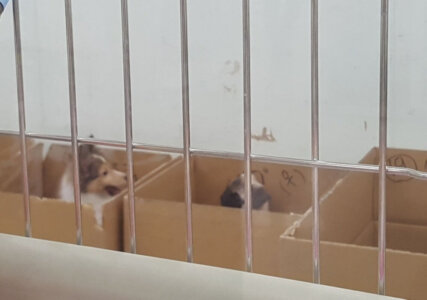 Aus den brauen Kartons war teilweise leises bellen zu hören, manche sprangen hoch oder stellten sich auf die Hinterfüße um über den Rand zu sehen. Der kleine Collie (?) und der Mops waren ganz wild. Die Tiere werden sehr teuer verkauft – sie kosten zwischen 1100 und 2400 Euro.