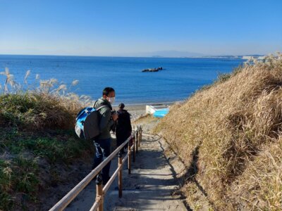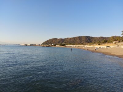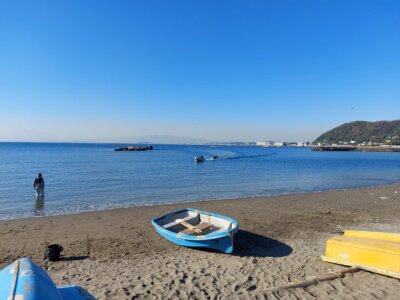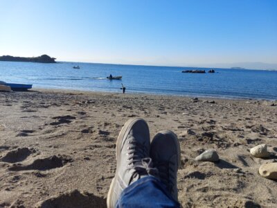 Unterwegs haben wir uns im Supermarkt mit Mittagessen eingedeckt und uns dann am Strand ein schönes Plätzchen gesucht. Wir hatten Glück, dass der Fuji an diesem Tag zu sehen war – normalerweise sieht man ihn dort selten. Es war ein herrlicher Nachmittag mit Muscheln und Steine suchen, rumsitzen, quatschen und Sonne genießen.