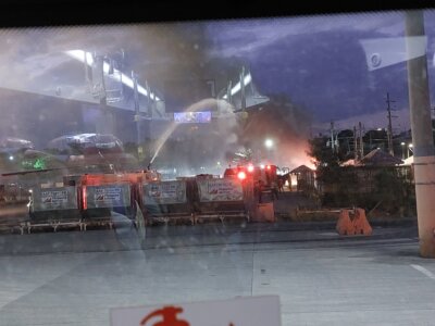 Der Bus musste wohl stehen bleiben, es wäre mir aber lieber gewesen, wenn er uns etwas mehr Abstand zum Feuer verschafft hätte, wer weiß WAS da brennt? Könnte da was explodieren? Aber auch hier alles gutgegangen 😉